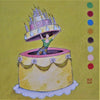 Image: Excited girl hopping out of yellow birthday cake, light green background.