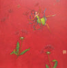 Playful art card by Gaelle Boissonnard of France. Image: tall slender whimsical girl playing with dandelions. Colors: girl in green, crimson background.  Blank inside, 16 x 16 cm    (6 x 6 in).