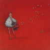 Appealing art card by Gaelle Boissonnard of France. Image: tall slender whimsical girl, hands behind back, holding bird cage with flying heart notes. Colors: girl in aqua blue with striped leggings. Blank inside, 16 x 16 cm (6 x 6 in).