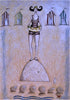 An early art card by Gaelle Boissonnard of France. Image: girl in striped bathing suit standing on a rock. Colors: girl in red & white suit, background sandy yellow & blue. Blank inside, 12 x 17 cm    (5 x 7 in).